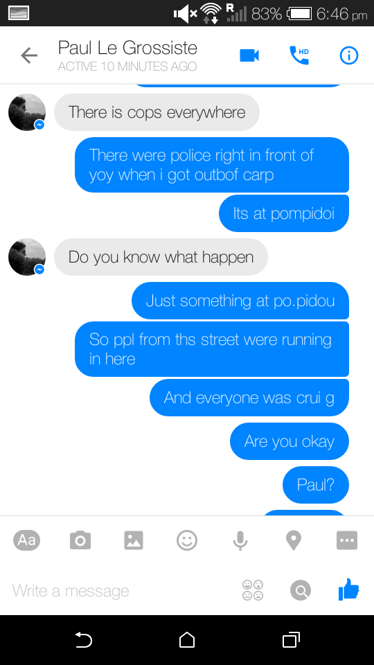 Through the rest of the evening, I began to receive messages and texts from friends in London asking if I was safe, if I was okay, what was going on. I increasingly became more and more annoyed? Angry? Confused? I’m not sure. Nothing was happening to me! I was fine! I barely even live in Paris! Apparently, my boyfriend got a text from one of his friends, who was asking what I thought of everything going on.